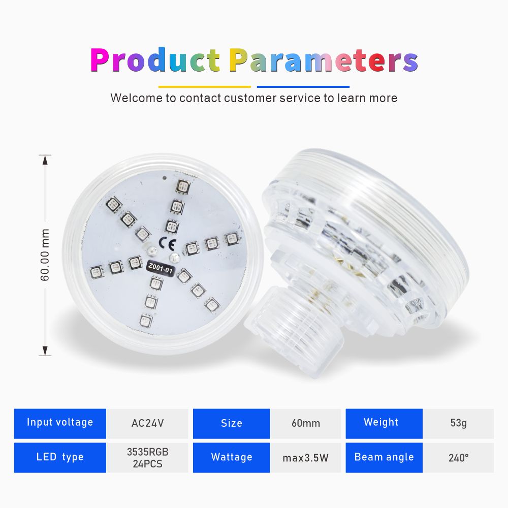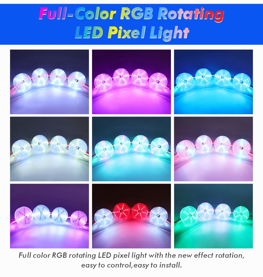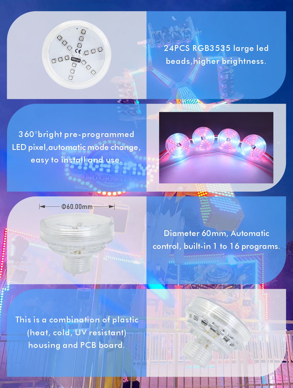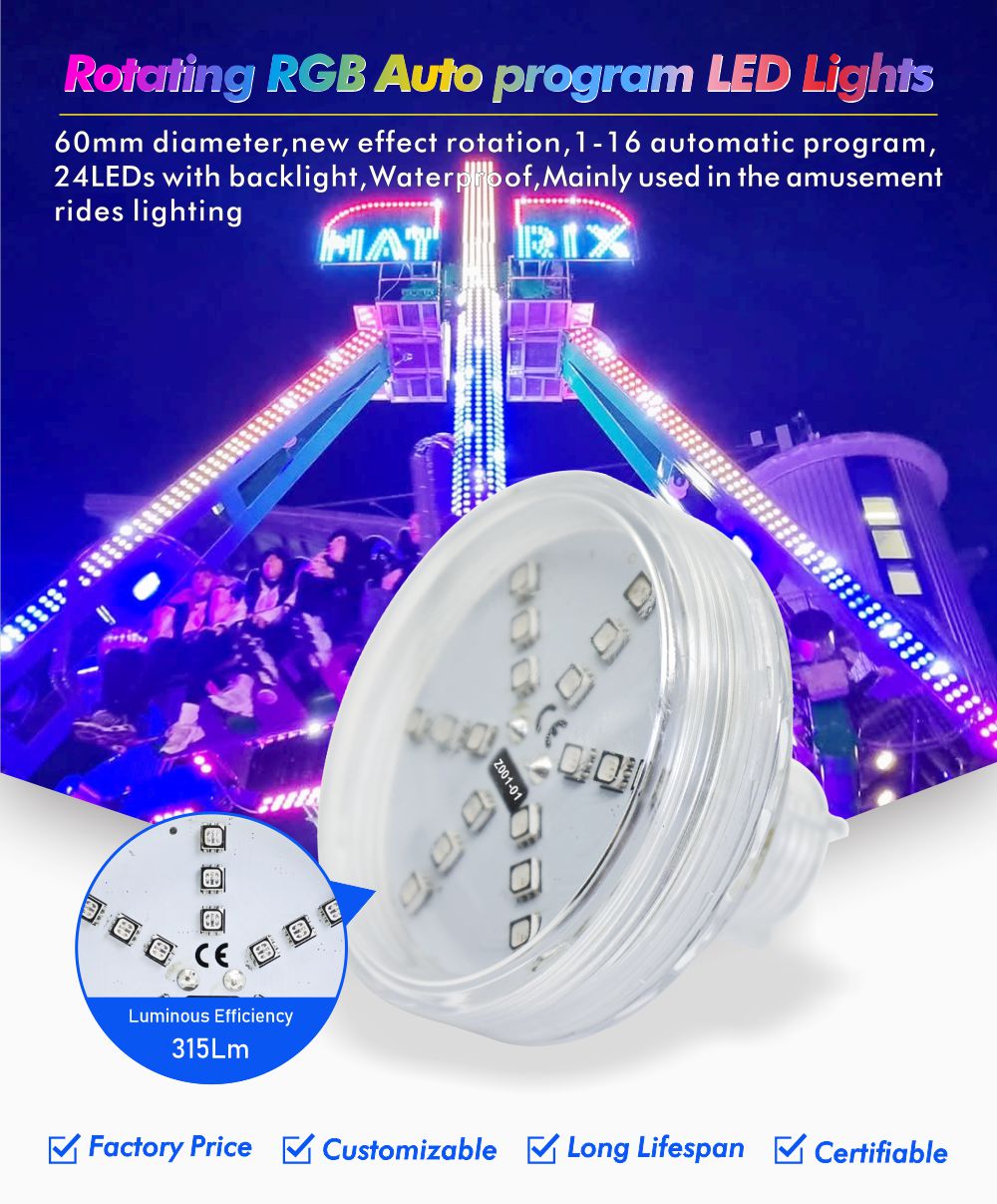 1.60mm全彩LED点光源:24颗3535 RGB高亮灯珠 + 内置自动程序,发光面大、色彩饱满,无需控制器即可实现跑马、渐变等动态效果,即装即用,点亮游乐设施与夜景空间!