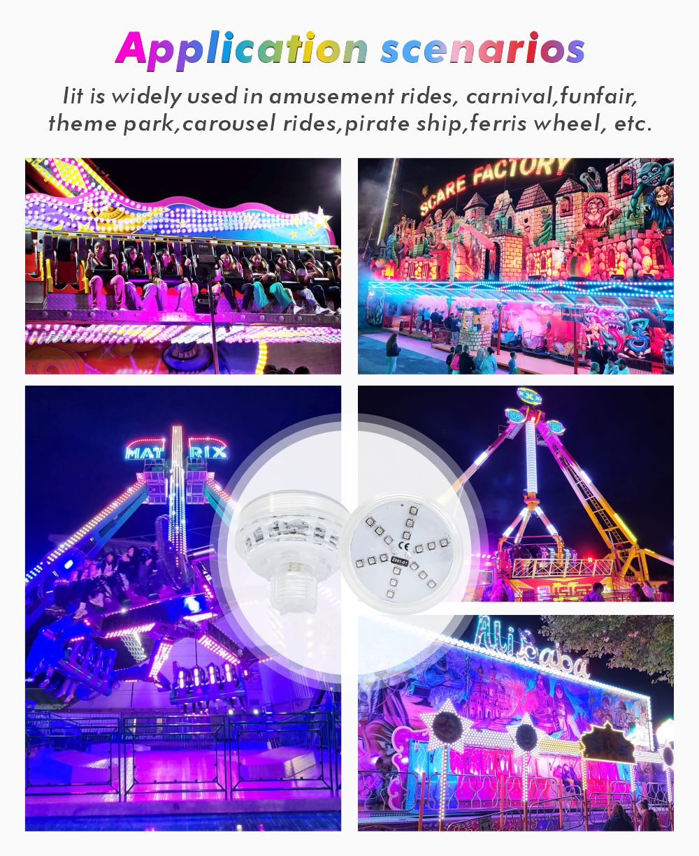 配备24PCS SMD3535 RGB大尺寸灯珠,60mm直径发光面确保远距离可见性与均匀光效,是主题公园LOGO、摩天轮轮廓、旋转木马装饰的理想选择!