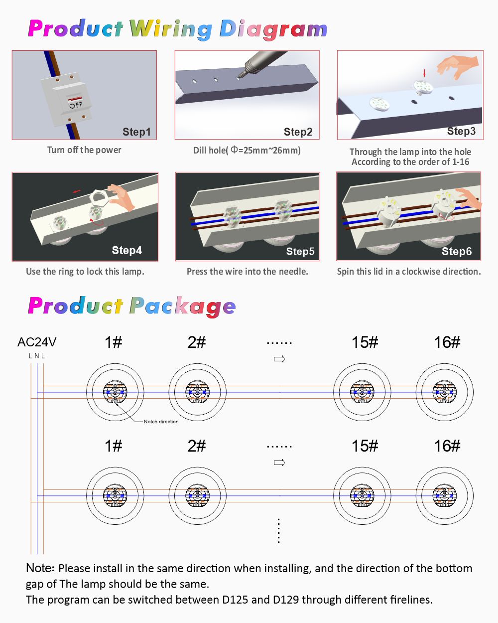 安装时请按同一方向安装,灯的底部缝隙方向应一致。