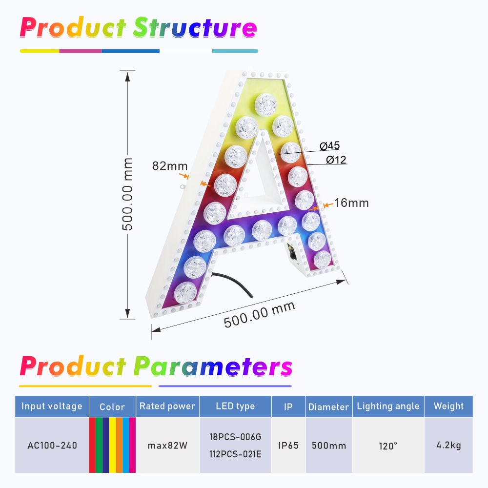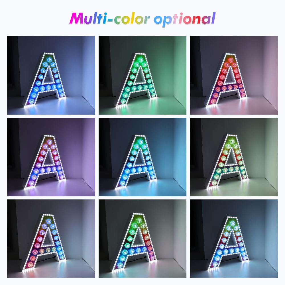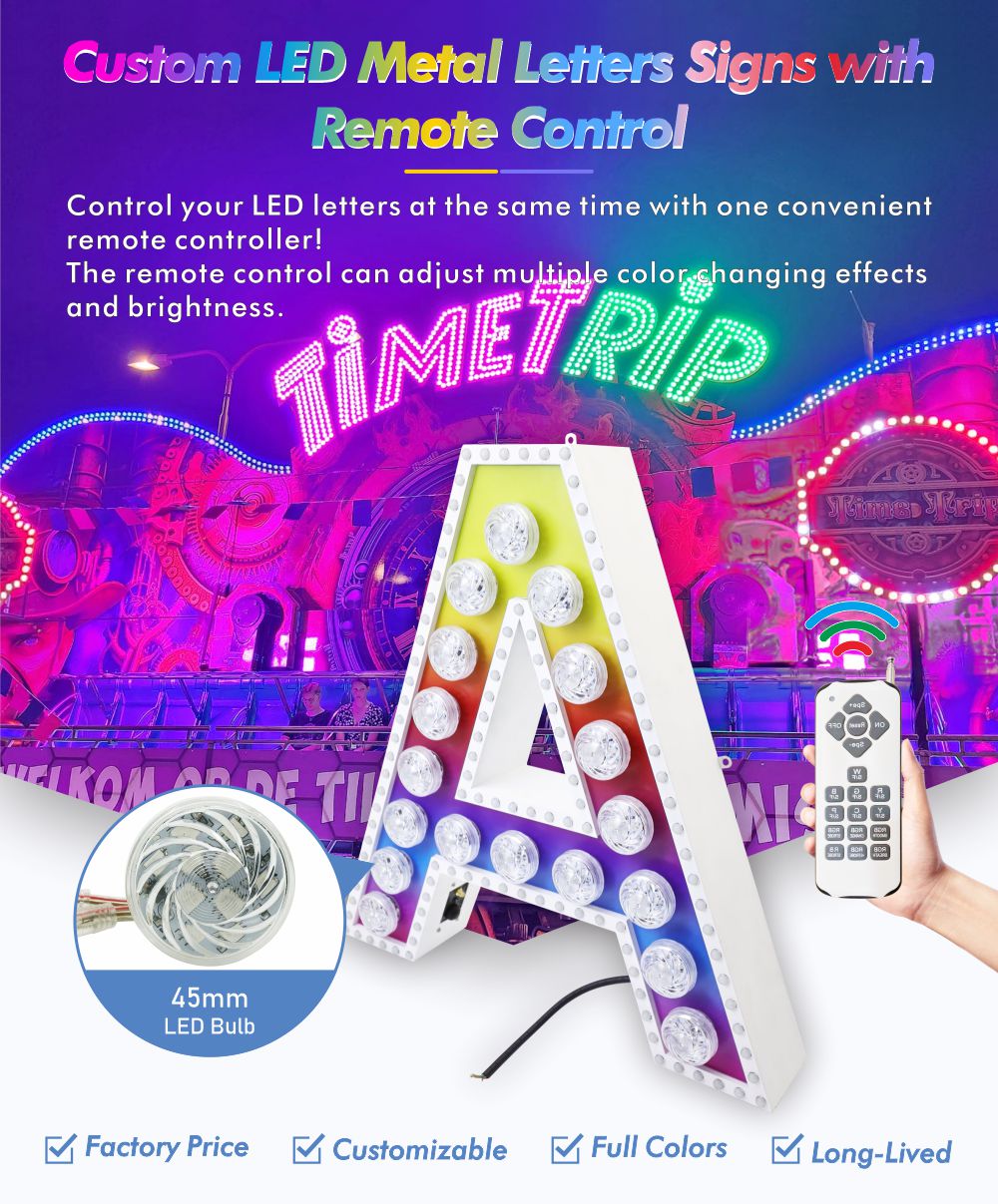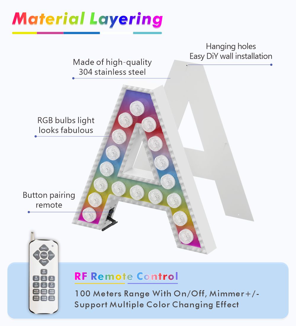 这些金属LED字母带灯由304不锈钢和LED灯泡制成,配备18键遥控器,可提供多种颜色变换效果。为您的商店招牌、游乐设施、游乐园、集市、婚礼、周年纪念活动、节日、圣诞装饰增添色彩。