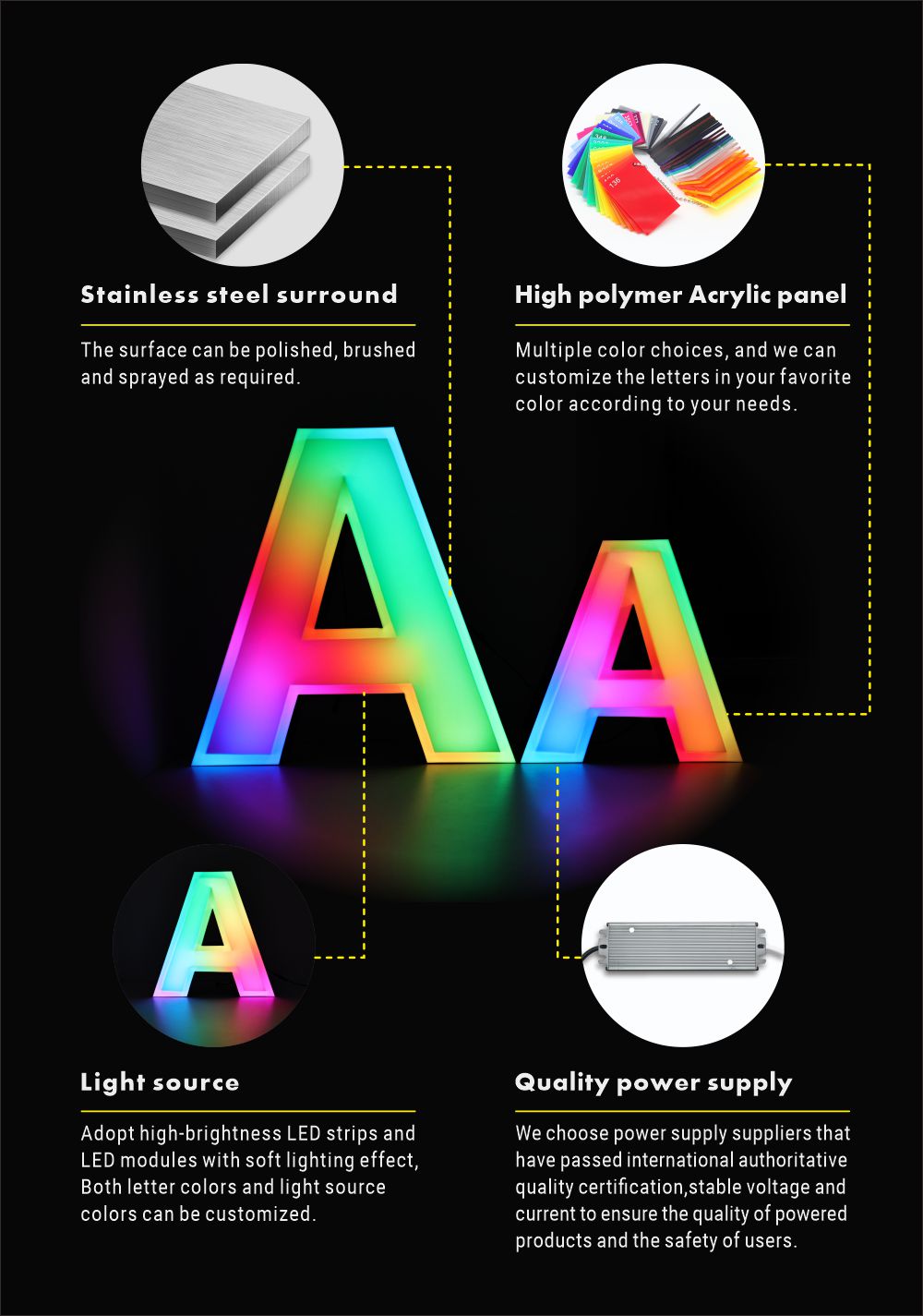 使用我们的定制字母led发光字彩色亚克力字母招牌,这些字母led发光字采用优质亚克力材料和LED灯制成。